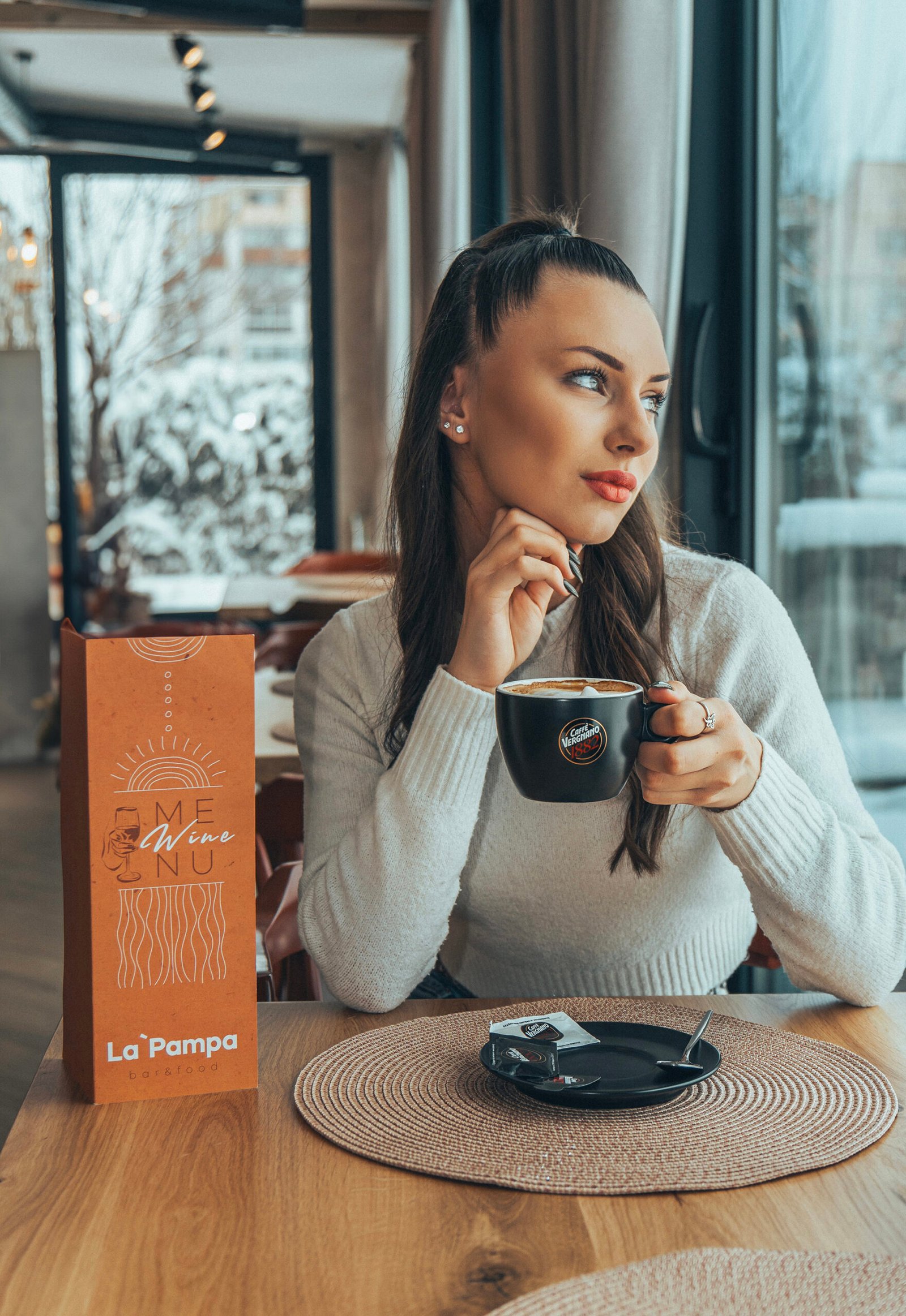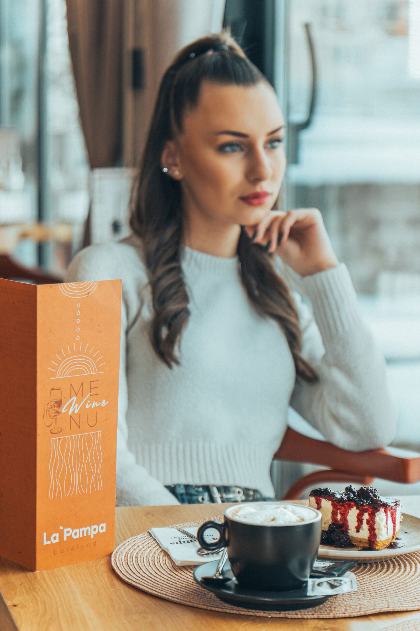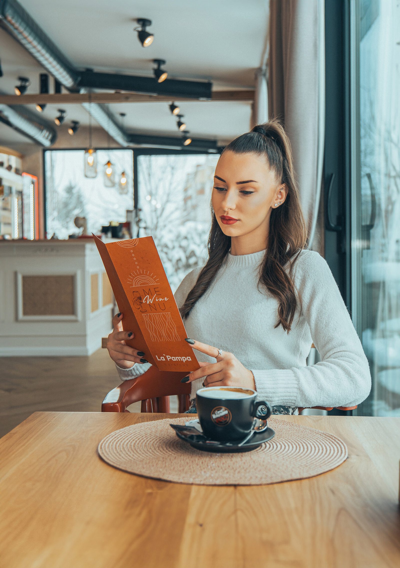 Професионална фотосесия за заведение La Pampa. Уютни и модерни кадри в заведението с модел, създаващи усещане за стил и комфорт.